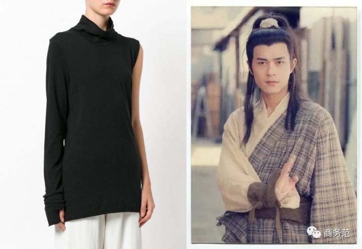 女装也同样是长款偏多,且更加另类。像是这款单肩高领打底,有时阔以“独领风骚”。但也有人说,这个款式太奇葩,一不小心可能会一秒钟变杨过~
