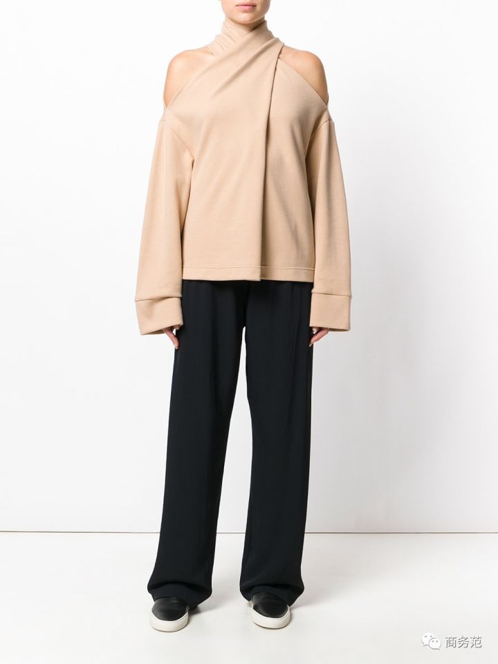 还有一款是交叉套头高领,漏肩设计不显肩宽,算是给性冷淡风格添了一抹彩。但也有网友疑惑,这款穿上真的不会勒脖子吗?
