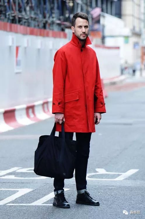男士方面,想穿红色冲冲新年的喜气,一件红色外套会是不二之选,衣服上的黑色纽扣细节与黑色长裤、绑带鞋、拎包相呼应,气场与喜庆都不缺。