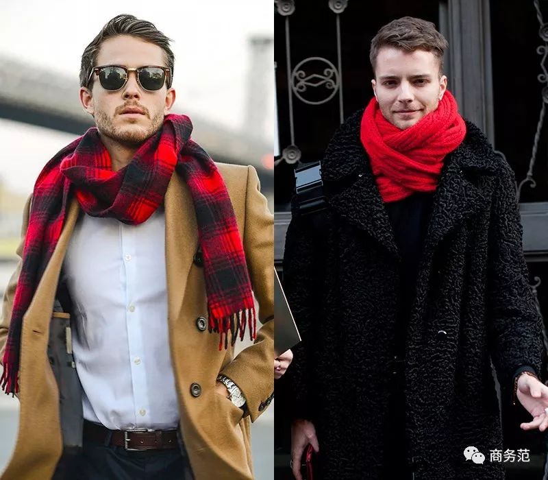 围巾对于不想穿红色又想显喜庆的男士来说,是个绝佳单品。试想一下如果摘掉下图二人的围巾,画面就会显得单调。