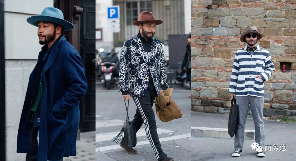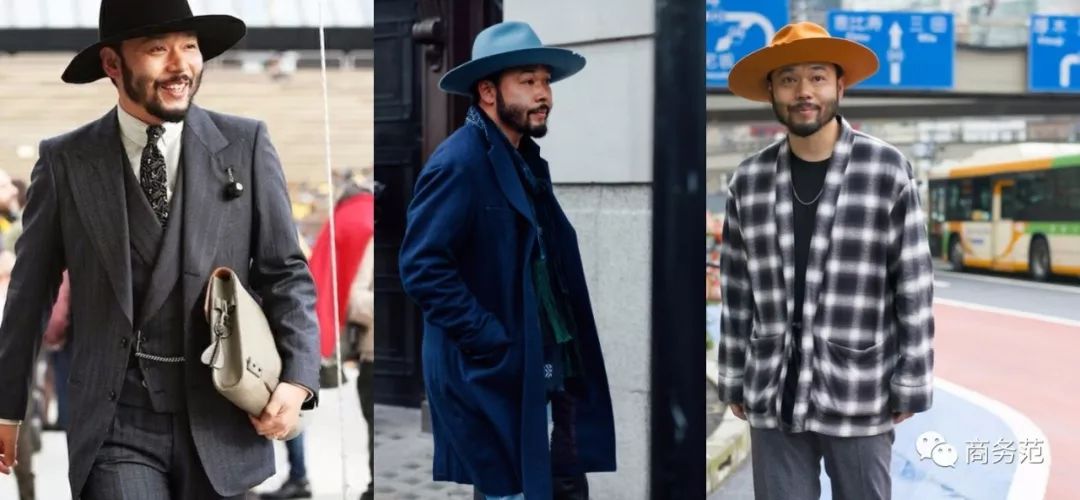 对于小木基史来说, 头顶形影不离的宽边帽子是他最大特色。在很多Look经常出现↓