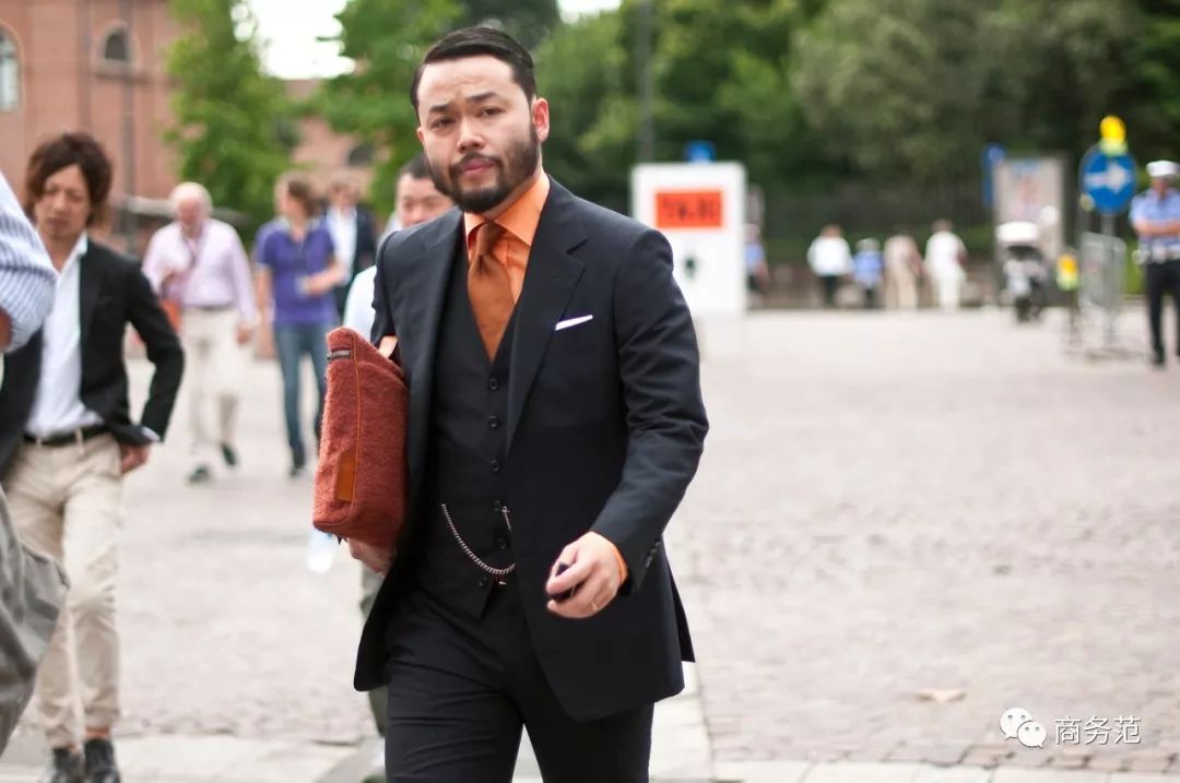 小木基史就很擅长西装加入一些新元素,塑造“痞”味,比如出挑的领带↓
