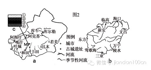 (2)根据古河床沉积物在不同时期的变化特点(图2c),可以推测M古城地区河流径流量最大的时期是_____(填序号),判断的理由是_______________。目前,该地的主要生态环境问题是________,应采取的治理措施是______________。