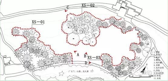 从图7中看出,空间主要靠乔木层来围合,雪松枝条贴近地面,能很好的限定空间的边界。由于雪松林下空间有限,不利于植物的生长,灌木层和地被层盖度较低,生态性得到了较好的体现。雪松单一树种的集中种植体现树种的群体美;适当的缓坡地形,更强调了雪松伟岸的树形;由其围合的空间主题也相当明确。但是雪松生长周期缓慢,要形成稳定的植物景观需要较长的时间,所以设计师在雪松林缘配置了8株樱花,来丰富春景(图3);在草坪中设置了XS-02植物群落,划分了草坪空间,增加了长轴上的层次,延长了景深,无患子、枫香的秋色叶为整个草坪空间增加了绚烂,桂花的香味则拓展了植物空间的知觉层次(图4)。这些植物特色鲜明,见效快,与雪松主景配合,丰富了季相变化,协调了近期、中期、远期的景观效果。