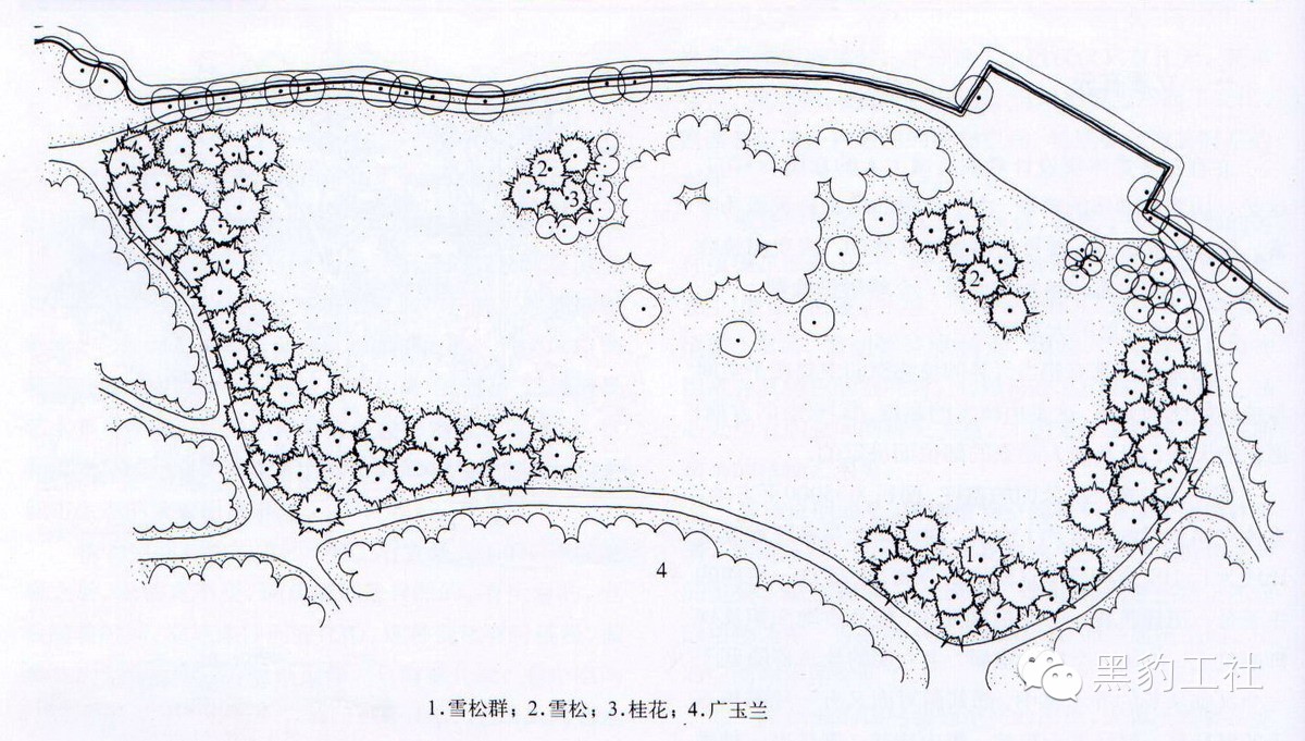 在路径的处理上,广玉兰、山茶林带起到了很好的背景作用,把游人视线引向雪松大草坪空间(图6)。该处空间的开口留出了足够的水平视角和视域,借助缓坡地形和林缘线的处理,提供不同视距的观赏地点,充分发挥雪松的观赏特性,远看高耸、稳重,近赏又觉树形挺秀,雄浑多姿。