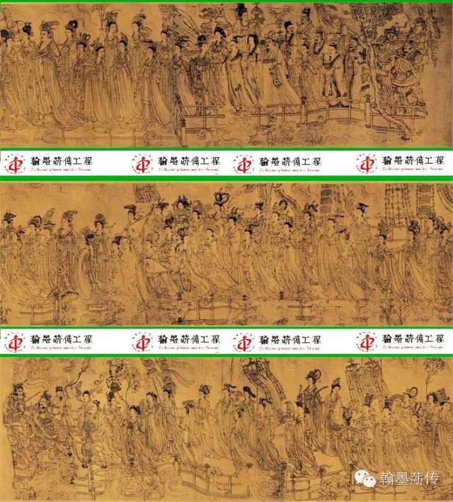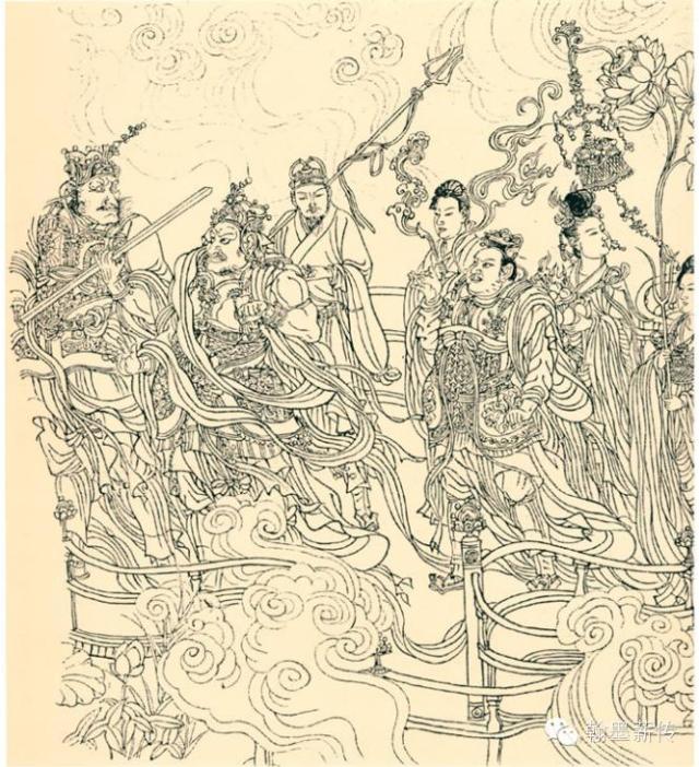 三是在色彩的调配上,早期作画色彩壮丽绚烂,后期则“浅深晕成”“敷粉简淡”。吴道子与其“疏体”相适应,采用淡着色作画,增强了表现效果。他的人物画线条已然独具特色,所画人物衣褶飘举,具有天衣飞扬、满墙风动之势,再于焦墨之中略施淡彩,则更显意态,这种画技风格世称“吴装”。这与北齐著名画家曹仲达所画中国佛像的“曹装”风格截然不同:吴之画,其势圆转而衣服飘举;曹之画,其体稠叠而衣服紧窄。故后世以“吴带当风,曹衣出水”两句话来概括他们画技画风的不同特点。色不碍墨,这种淡彩敷法对当时以重彩为主流的人物画而言,是种创新。