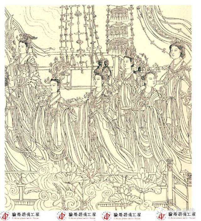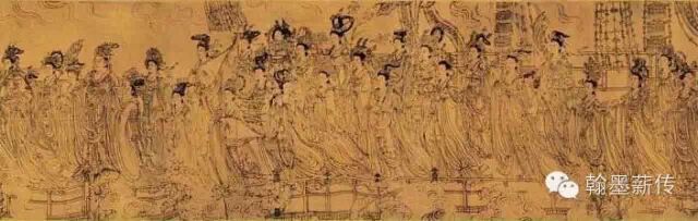 一是在线条的运用上,由“密体”转变成“疏体”,更利于刻画人物,表达强烈的主观情感,成为其独到的符号语言。吴道子早年用线,为细密紧窄,连绵古拙的“密体”。《广川画跋》语“如铜丝萦盘”,线条在画面的组织往往追求“疏可走马,密不透风”的艺术效果。其中最具代表性的作品,是流传到现在的粉本《八十七神仙图卷》,画面人物众多,游行自在,衣袖宽松、裙带飘举,线条细劲纤长、疏密得当,极具运动感与飘逸感。杜甫曾在洛阳玄元庙看到吴道子奉命作的壁画,写下了《冬日洛城北谒玄元皇帝庙》赞诗:“画手看前辈,吴生远擅场。森罗移地轴,妙绝动宫墙。五圣联龙衮,千官列雁行。冕旒俱秀发,旌旆尽飞扬。……”既赞吴道子画技,又描写了壁画满壁风动的气势场面与震撼人心的艺术效果。其中“妙绝动宫墙”一句,更成为了后世对吴道子艺术风格与魅力的经典评语之一。令人诧异的是,杜甫这首论画诗中的描述,如“千官列雁行”、“旌旆尽飞扬”等句,竟与《八十七神仙图卷》画面内容相吻合,真是令人匪夷所思。其画正如段成式所说的道子画有“天衣飞扬,满壁风动”的特征,应皆来源于画中人物动态与衣纹的处理善取动势,因而产生当风飞扬的视觉效果。到了中年进入成熟期后,技法则有所改变。正如吴道子自言:“众皆密于盼际,我则离披其点画;人皆谨予象似,我则脱落其凡俗。”后世把他的这种技法与张僧繇的技法并称为“疏体”,以区别于顾恺之、陆探微紧劲连绵较为古拙的“密体”。吴道子开创了“疏体”的兰叶描,或称莼菜描,“行笔磊落,挥霍如莼菜条,圆间折算,方圆凹凸”,他用自己独创的线条语言描绘出来的佛像式样,被称作“吴家样”,同时也打破了人物画长期沿袭的顾、陆的铁线描法,将中国画的线描技法创新向前推进了一大步。 http://mmbiz.qpic.cn/mmbiz/Micnnsr4RNWLYbZ7IYPwNL7pdiaP0xMxkQgED0olbb41SjoPDfo7eVfDJ6CRqPicoKZ2jRpSHgu3ZGlICkicY7q9ng/640