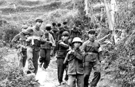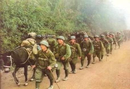 图为149师师长康虎振、政委徐金堂带领警卫人员从龙金高地向332高地的路途中。照片是1979年2月在中越边境自卫反击战中,陆军149师师指挥所从龙金高地向332高地徒步转移,师首长