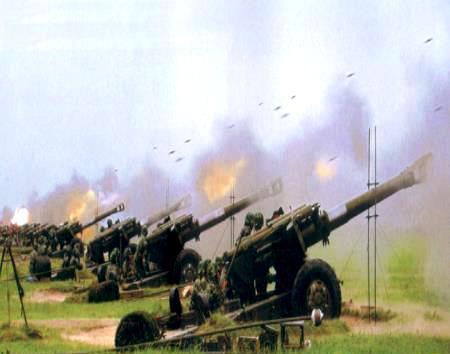 图为3月2日7时45分,陆军第149师炮兵群向达果北侧、奔西爱、蒙先、朱奈、珍珠琳、马匝地区之敌实施了15分钟炮火急袭支援前线步兵战斗。8时,师主力在强大炮火支援下,对4号桥地区守敌发起了猛烈攻击。