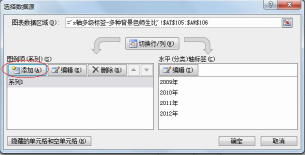 选中图表,在右键菜单中选“选择数据”(或在Excel界面上“图表工具”-“设计”-“数据”-“选择数据”),在“图例项(系列)”中点击“添加”,将上述辅助数据列AT108:AT111作为系列2添加到图表中,同样将辅助数据列AU108:AU111作为系列3、AV108:AV111作为系列4、AW108:AW111作为系列5,一个一个逐个添加进去(整个区域不能同时一起加入):