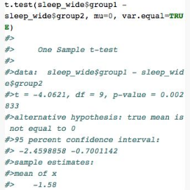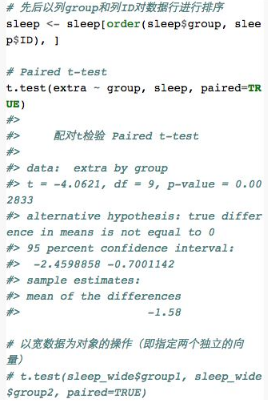 同样的,在上文中我们提及了t-test函数可以兼用于一个带有分组变量的数据框或是两个独立的向量。在配对样本中,样本的配对关系取决于其对应的位置。如果我们的数据集为包含分组变量的数据框,那么程序将默认group=1的数据行中的第一行与group=2的数据行中的第一行相互匹配。所以我们需要特别注意数据的排列顺序并确保其中没有缺失值,否则样本间的配对就不得不被打破。在下面的例子中,我们运用group和ID两个变量来确保数据排序的正确。
