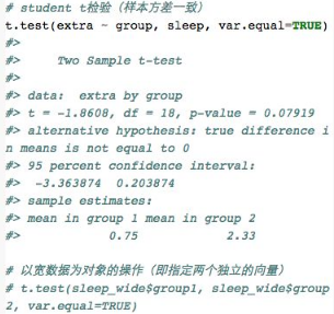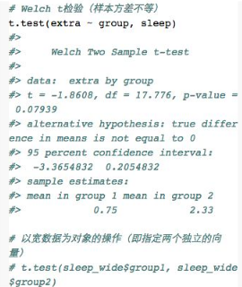 t.test函数可以直接用于检验像sleep这样的长数据,在下面的例子中,列extra中记录着用于检验的数值,而列group则为样本的分组依据;如果数据没有以数据框形式存储,我们同样可以通过指定两个独立的向量来完成这一操作。