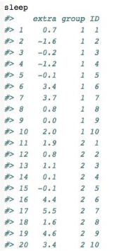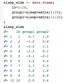 接下来,我们将sleep数据集处理为宽数据;在之前发布的教程中,我们曾谈到过数据集长宽转换的方法(R语言行动指南-36:长数据与宽数据的转换)。