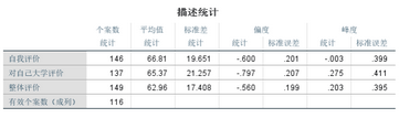 我们要做的是用spss对三个连续型变量(数值型变量)做描述性统计分析,具体要分析的指标是,这三个变量的平均值,标准差,峰度系数,偏度系数,以及得分率(有一部分人没有回答问题,因此需要统计有多大比率的人回答了该问题,要统计得分率)。