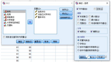 然后通过【分析】-【描述统计】-【描述】,菜单来获取这三个变量的其它统计量,如下图所示,把我们感兴趣的统计量勾选,然后点击【确定】。