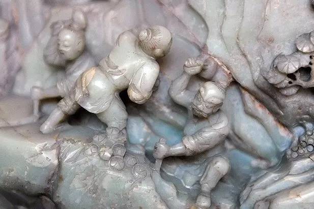 大禹治水玉山静静地安置在乐寿堂后部,玉山上峰岩高耸,古木苍劲,瀑布飞落,又有云雾升腾至巅顶。玉山上下三五成群凿石开山的劳动场景富于戏剧性,共有十几处,工匠们分别使用不同器械劳作,像是古代开凿技术的大会演。但玉山上部的情形则更富浪漫气息,不仅有奔跑跳跃的麋鹿和猿猴,有快要登上颠峰的老者及仆从,更有神仙以雷火来助开山。玉山背面铭刻着乾隆皇帝为这座伟大的玉山所作的长诗及注文。