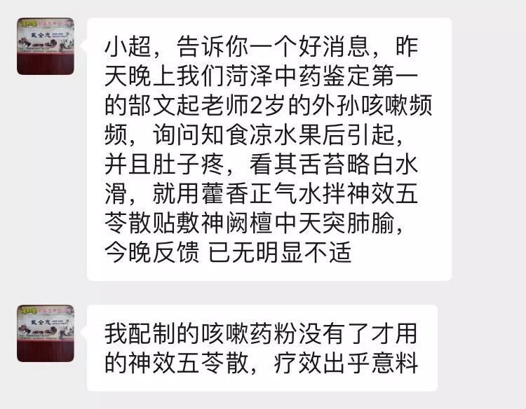病例2:食冷咳嗽,用藿香正气水拌五苓散穴位贴敷