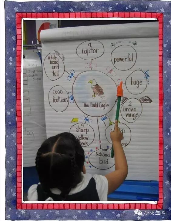 圆圈图强调的是一个概念的具体展开,而气泡图,则更加侧重于对一个概念的特征描述。比如这个孩子在用气泡图分析一只鹰有哪些特征。看起来有点混,是不是?其实,檩子觉得,大家在实际带孩子分析问题的时候,不必太纠结到底该用哪种图,怎么直观怎么来,就行。