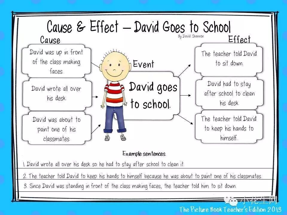这张是童书里的著名人物大卫小朋友,他去学校后,做了哪些事,导致了什么样的结果,用这个思路帮孩子分析自己在学校里的种种遭遇,明白自身行为和这些遭遇之间的关系,会很有趣。
