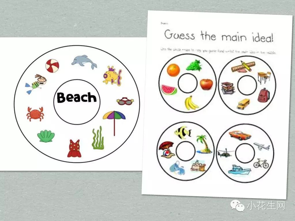 下面是国外一个幼儿园孩子做的圆圈图练习。左边是一个典型的联想型圆圈图;主题是海滩,可以联想到螃蟹、鱼、遮阳伞、海草、游泳衣、海豚,等等。