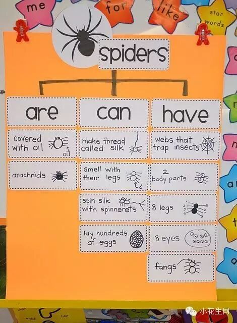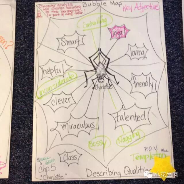 气泡图特别能帮助孩子学会使用丰富的形容词,有个孩子读完了《夏洛的网》,为书中的蜘蛛做了这样一张气泡图,在她眼里,这只叫夏洛特的蜘蛛具有一堆美好的品质:聪明、友好、有爱、有才、神奇