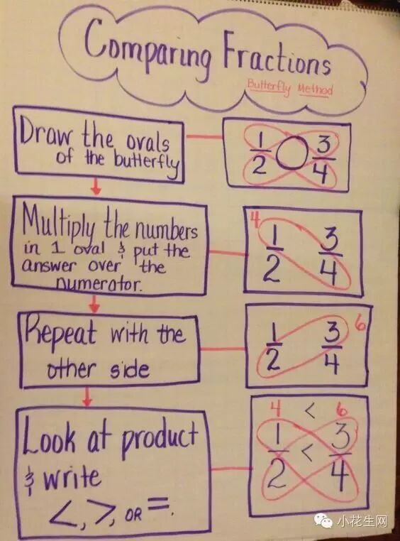 也有用流程图帮孩子解题的,第一步,第二步,第三步 ... 这是分数比大小的所谓“蝴蝶法”,说实话檩子是第一次看到有这种比大小的。