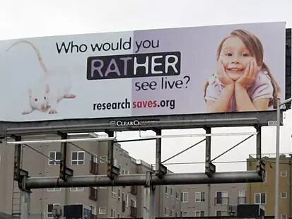 一个医疗机构用大量小白鼠做实验,遭到动物保护组织反对,于是设计了下面这个广告牌:小白鼠 VS. 孩子的生命,你想拯救谁?