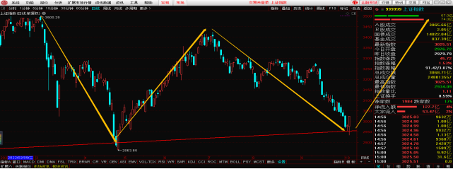 今天大幅度深V反转,社融数据超预期,主线全面爆发,市场开始反转第一步,下趋势线+估值底部+K线(下长影光头阳线)。