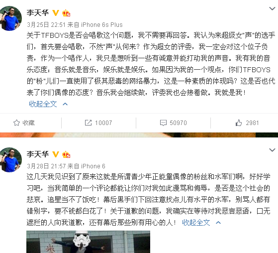 柯以敏说到这儿,另外两个与柯以敏坐在一起、同样对选手冷嘲热讽的评委,男子是李天华,曾不屑问:TF会唱歌?被TF的粉丝爆掉了微博