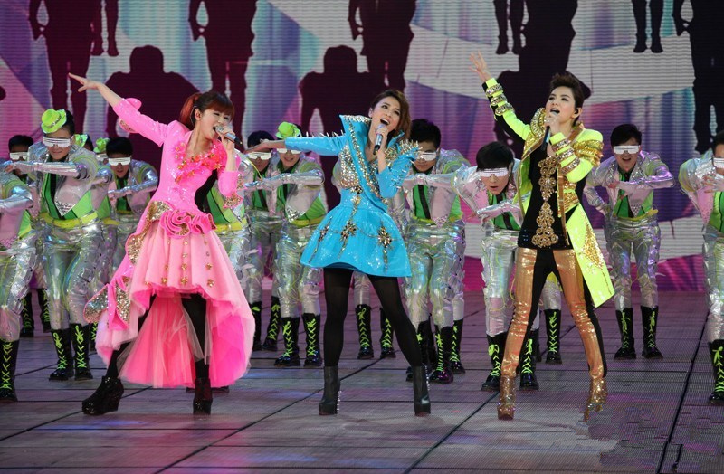 看看SHE,粉蓝黄齐齐上身,既保留了团员们各有特色的个性,金光闪闪的花纹点缀又和节日的气氛不谋而合,穿上它,你就是舞台上的super star