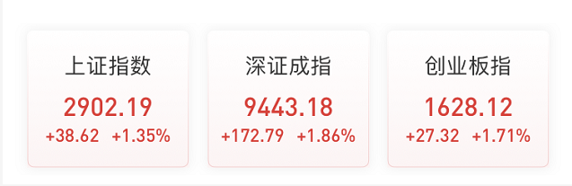 今天,上证指数时隔一个月,再次站上2900点涨1.35%,深证成指涨1.86%,创业板指涨1.71%。