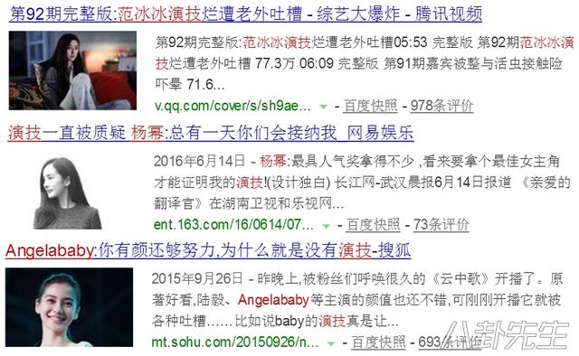 对了,写这篇文章之前,我是知道范冰冰爱做慈善,Angelababy也爱做慈善,杨幂有过雪见那时候的演技。但八先生还是要说,她们现在演的都是些什么鬼?