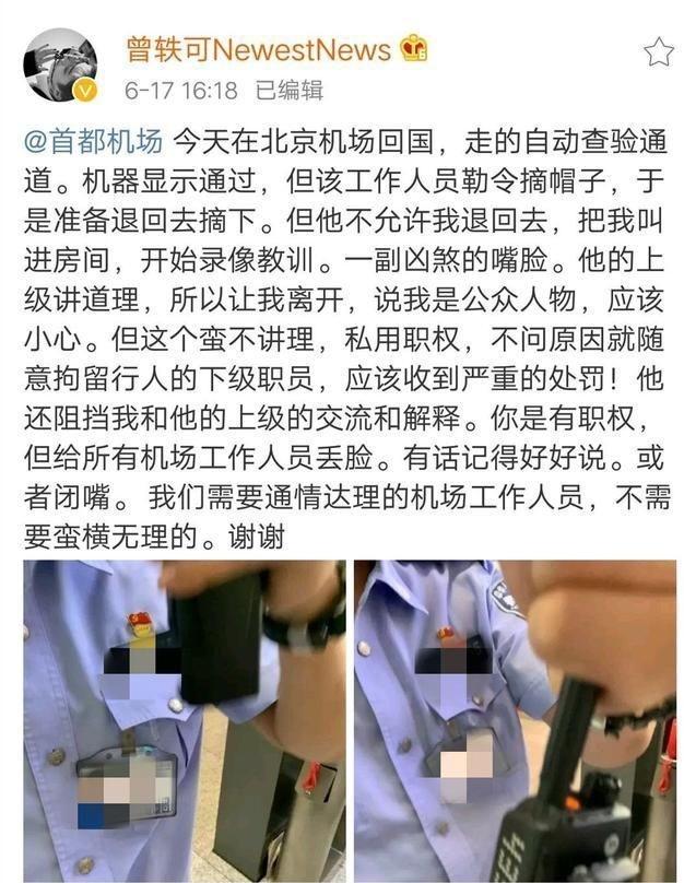 昨天,久未上新闻的超女曾轶可,因为一条微博上了热搜。根据曾轶可的微博,她在首都机场过安检时,虽然机器显示通过了,但安检人员“无理刁难”,让她摘掉帽子再检查,她还被叫进房间录像“教训”了。