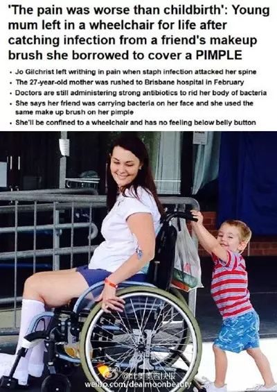 英国DailyMail报道,澳洲女子因用了朋友的化妆刷遮盖痘痘,受到严重的细菌感染导致下半身瘫痪!
