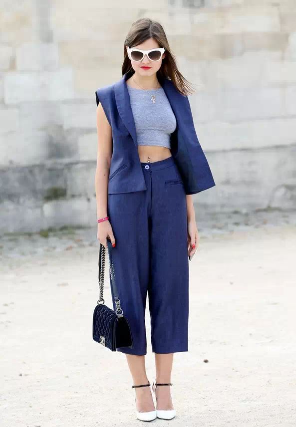 当下正热的露脐装搭配高腰阔腿裤让你显瘦显高的同时拥有时髦风格,在腰部的小范围露出,让腰部线条凸显,从而缩短上半身比例,达到“上短下长”的效果。明星纷纷示范,这一季选它就对了。