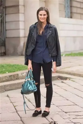随性街拍风:黑色铅笔裤 皮衣 平底鞋