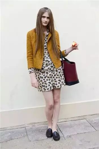 复古学院风:一件斑点花纹的OP 麂皮小外套 平底鞋