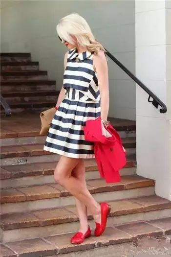 甜美女孩风:一双亮色的平底鞋是整身的亮点,俏皮可爱