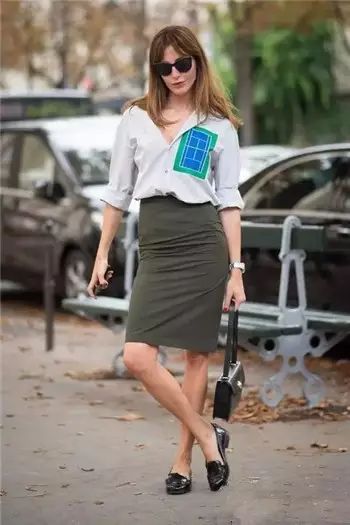干练职业装:宽松衬衫 过膝铅笔裙 平底鞋,裙子塞进裙子里