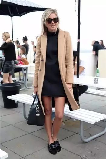 干练总裁风:小黑裙 驼色外套的经典搭配加上乐福鞋,相较高跟鞋会有别样硬朗的帅气感