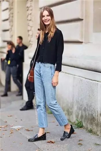 中性男友风:黑色衬衫 宽松牛仔裤 乐福鞋