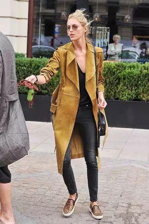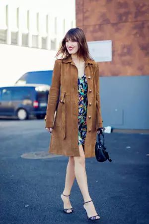 过臀长大衣内搭花色连衣裙,随意又性感。