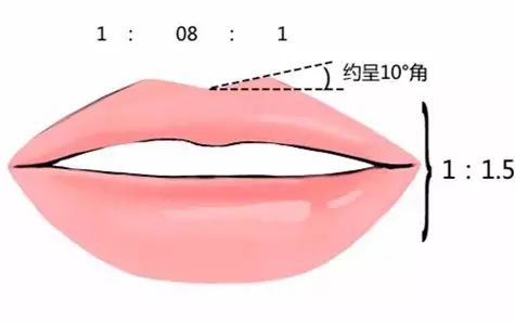 唇部横向的比例:两个唇角到唇峰的距离与两个唇峰之间的距离1:0.8:1的关系,上唇唇峰与唇谷约呈10°