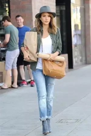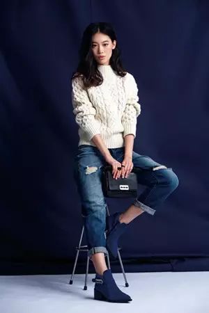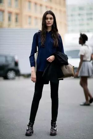 这一身颜色灰度高,不适合肤色黑的妹子;挽裤脚的做法也不推荐给小个头妹子,她此处挽裤脚不仅是为了更休闲潮范,也是因为宽松裤腿直接塞进低靴不好看,容易脚腕一片拥挤。PS:此处又见黄蓝配