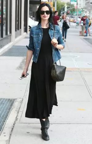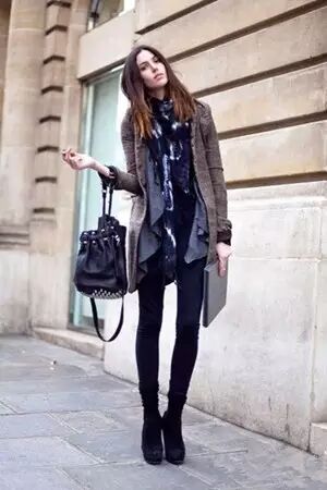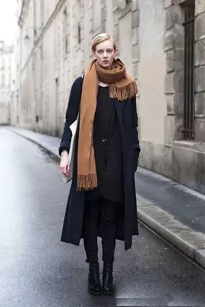 如果想和长外套一起穿,外套不要长及靴子,会让你变没腿的。一身深色可以用一条亮眼的围巾或大配饰(比如包包)来增添魅力。