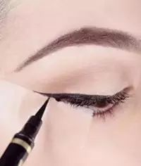 step3:前段紧挨睫毛根部画眼线,眼尾则沿着创可贴画就好了。记得描画时越画越细。