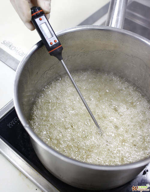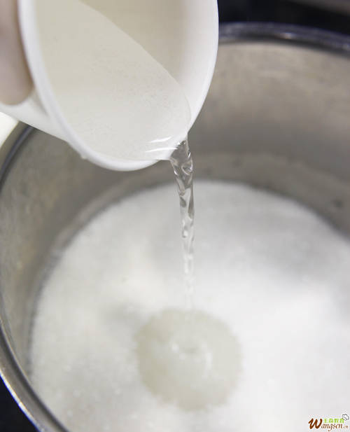 (2)当糖水沸腾时,加入葡萄糖浆。如发现锅边有砂糖颗粒,可以盖上锅盖20~30秒钟,利用锅内的水蒸气循环将锅边残留的砂糖颗粒冲入糖液中溶解。但不可搅拌,一是为了防止大量的气体搅入糖水内,导致翻砂现象;二是如果糖体要注入模具中,防止糖体内大量的气泡产生,要耐心等待糖体内水份的蒸发。