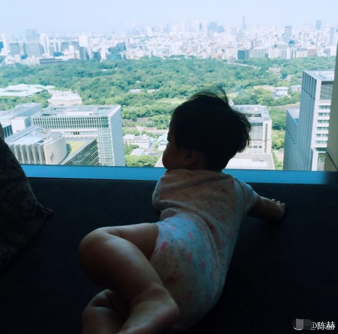 先来看下陈赫女儿安安趴下望着外面的景色,右手撑着地下。看起来似乎很像在思考什么。