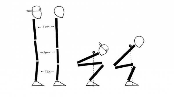 比如一个人天生股骨比胫骨长,脚又相对比较小,那么当他深蹲到低处时除非强迫自己向前趴、屁股向后撅,整个人的重心很容易被迫压在膝关节上,腰椎也会承受额外的压力,极易造成受伤。