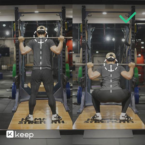 在做到腰背颈竖直的前提下,会比较容易找准你的重心,双脚踩实地面,让杠铃的重心和你的重心都保持在你双脚的正中间,你的深蹲会更稳定。